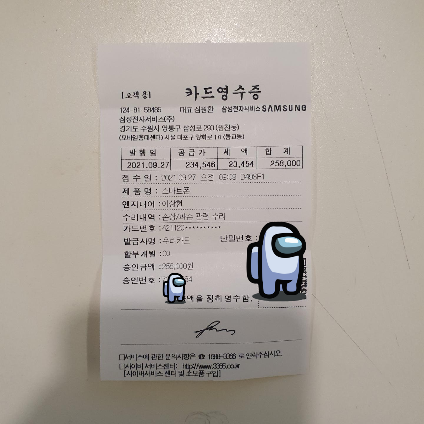 물론 사설 수리소를 가면 10만원대 교체가 가능하지만 이왕 고치고 쓰겠다고 하면 정식 삼성서비스센터가 좋을 것입니다. 방수, 방진까지 완벽히 테스트 해줍니다.